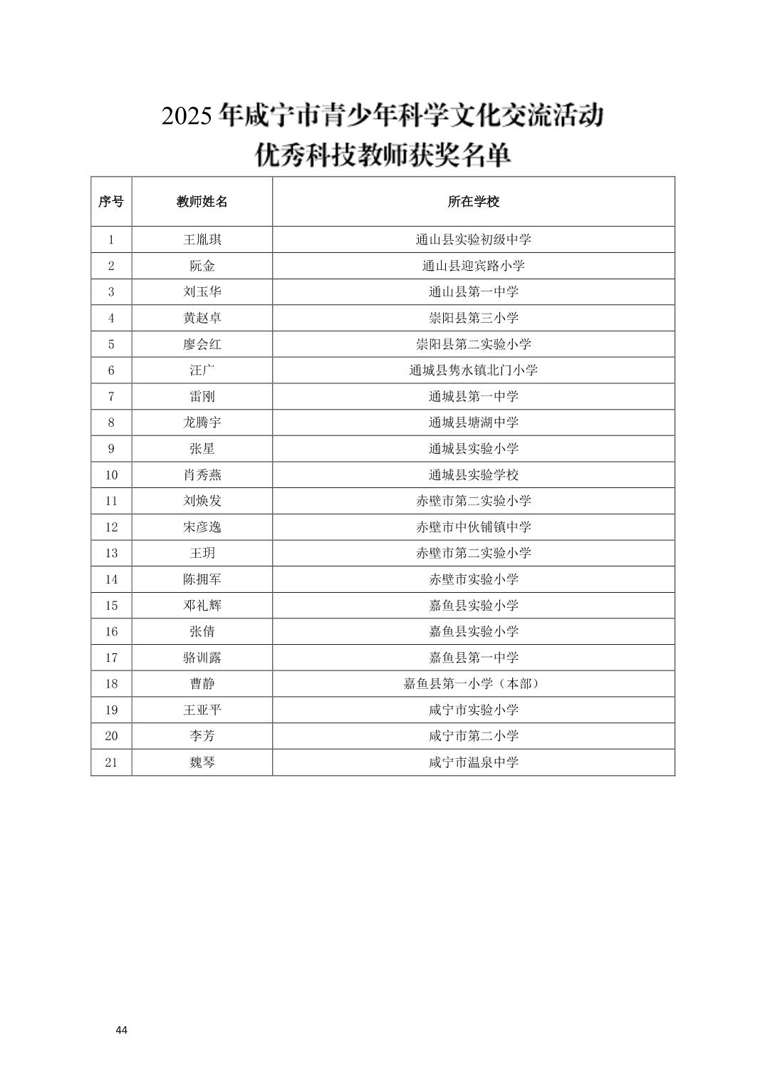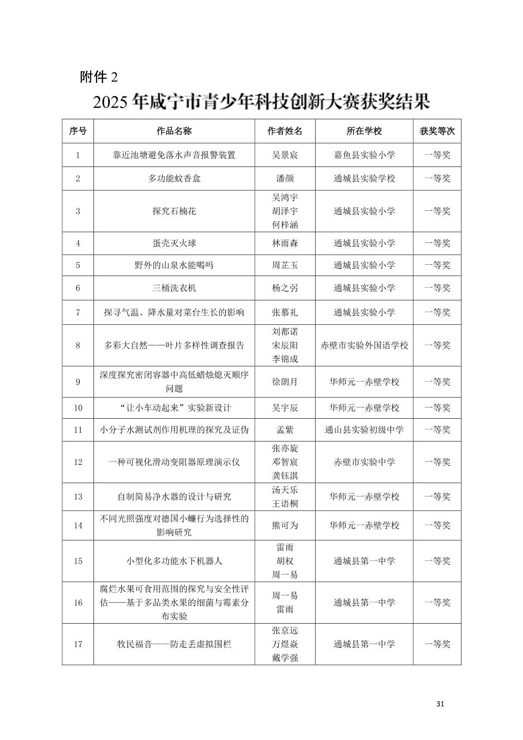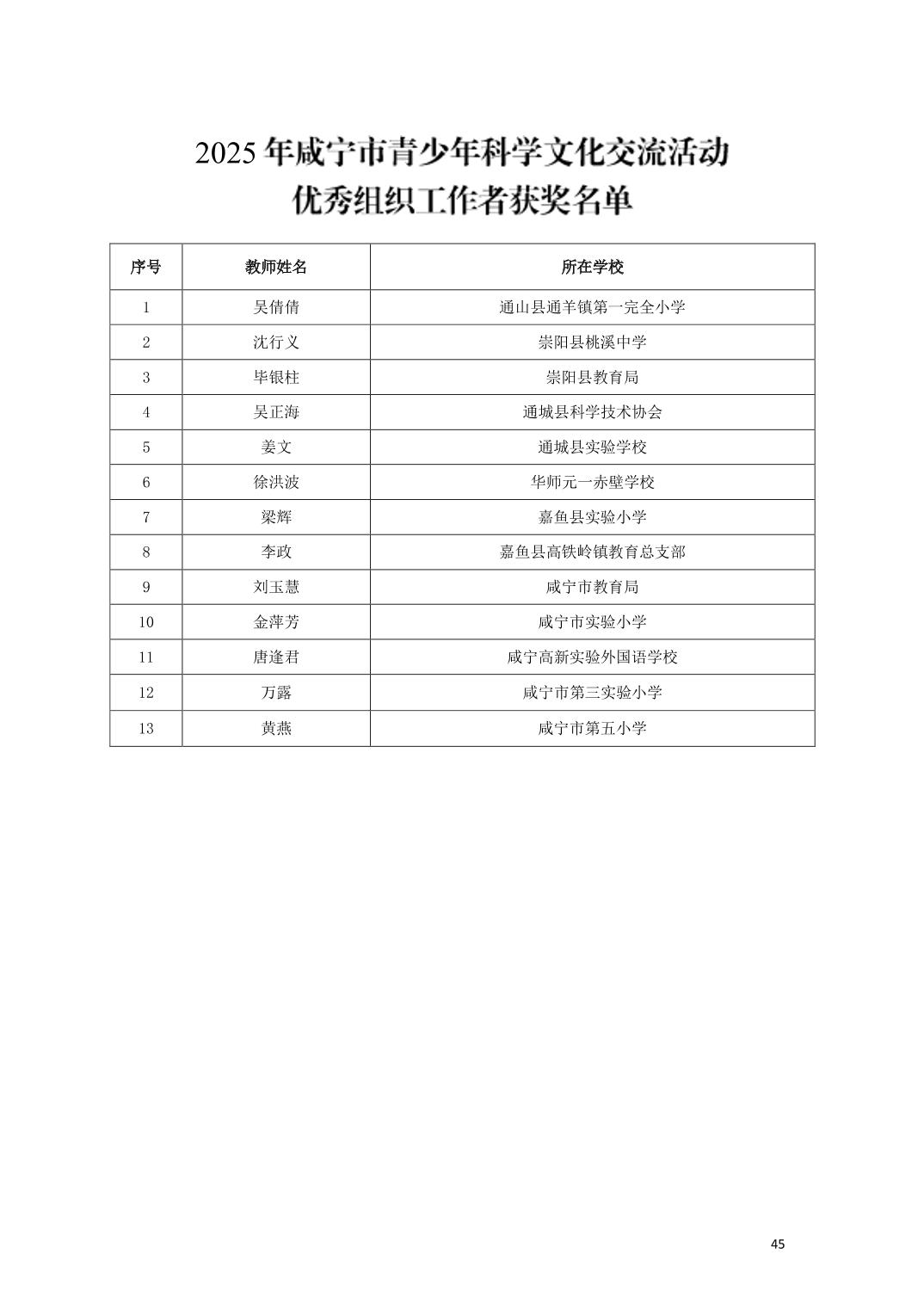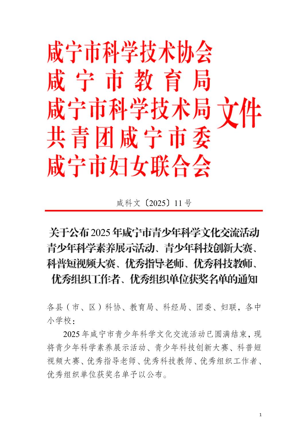 关于公布2025年咸宁市青少年科学文化交流活动青少年科学素养展示活动、青少年科技创新大赛、科普短视频大赛、优秀指导老师、优秀科技教师、优秀组织工作者、优秀组织单位获奖名单的通知